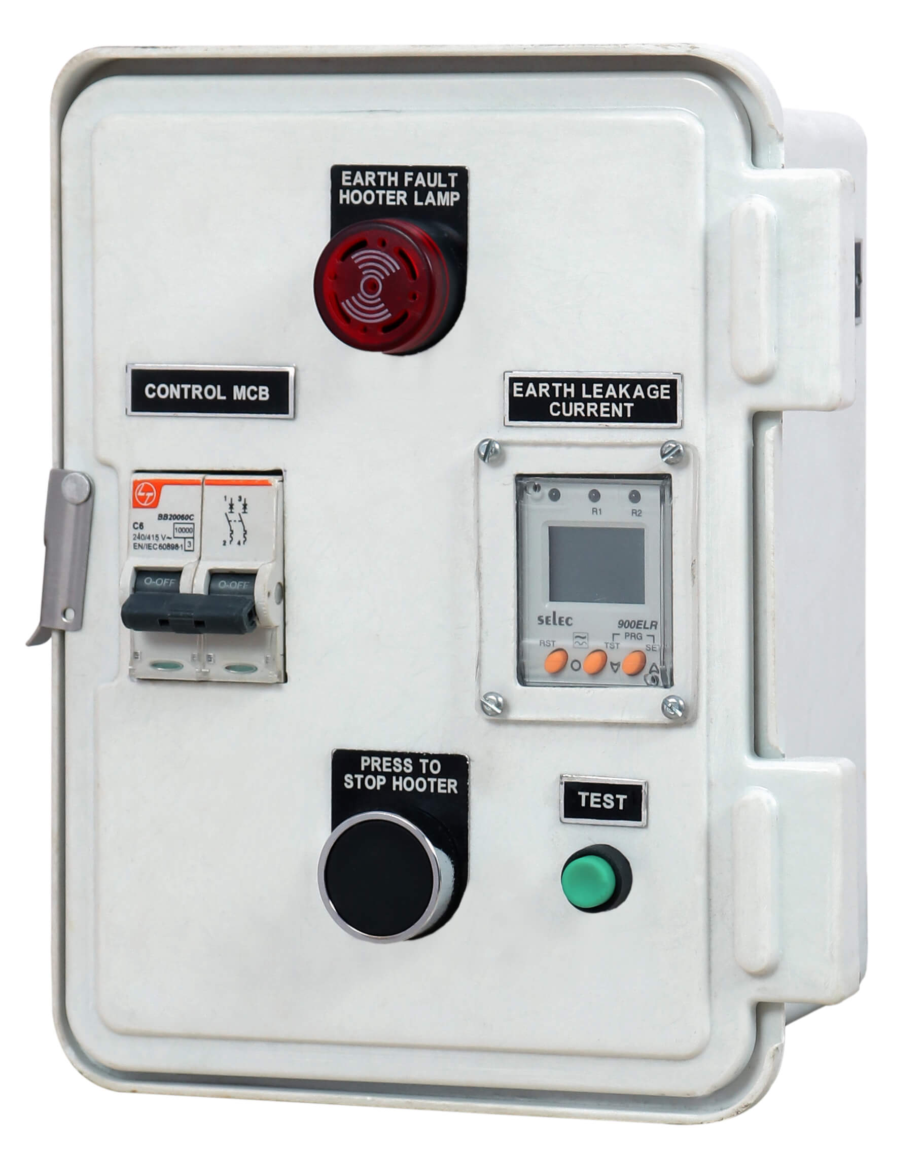 Wall mounted device consists of Control MCB, Earth leakage relay with earth leakage current indication, Earth Fault Red Hooter noise indication lamp, Push button to stop Hooter noise, Control Relay and Loose current transformer.